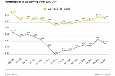 ADAC: Spritpreise sinken mit deutlicher Verzögerung - Super E10 im Wochenvergleich 3,2 Cent günstiger, Diesel 3,4 Cent